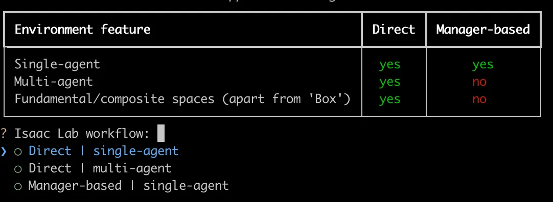 後で変更できますが、とりあえず`Direct`モードは自分でコードをいっぱい書かないといけない上級者向けなので、`Manager-based`+`single-agent`をお勧めします。