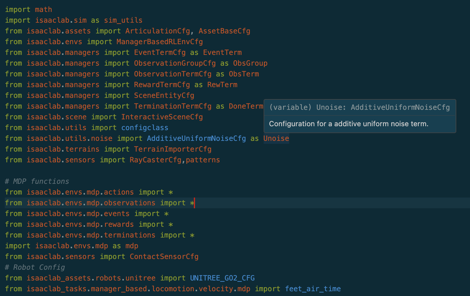 初期の段階ではこんな感じです。実はIsaacLabのライブラリは`site-packages`以下に格納されるわけではないので、初期のままだとインテリセンスは役に立ちません。`python.analysis.extraPaths`に**手動でこれらのライブラリを入れてあげます**。