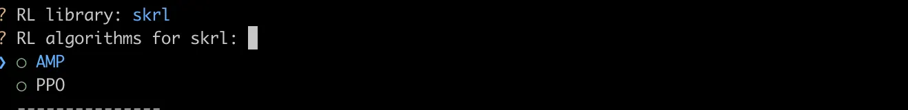 `AMP`アルゴリズムか`PPO`アルゴリズムかどっちか選べとあります。最初に生成されるファイルがちょっと異なるくらいで、別にどっちを選んでも問題ないですが、とりあえず`PPO`を選んでおきます。